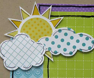 To make the colors pop a bit more, I stitched in black and doodled on the fun chipboard and sticker embellishments that come with the Summer Days line.